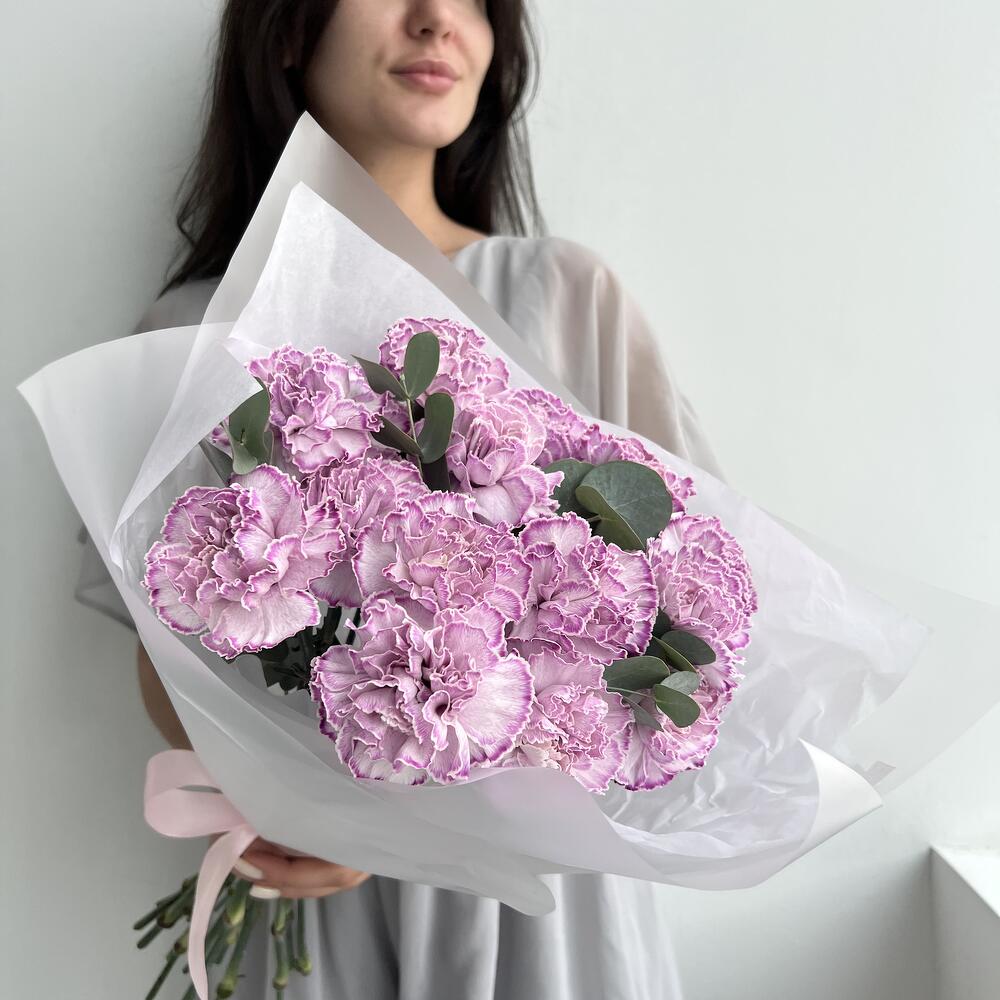Букет из 15 стеблей фиолетовой гвоздики с ароматным эвкалиптом в стильной, матовой упаковке